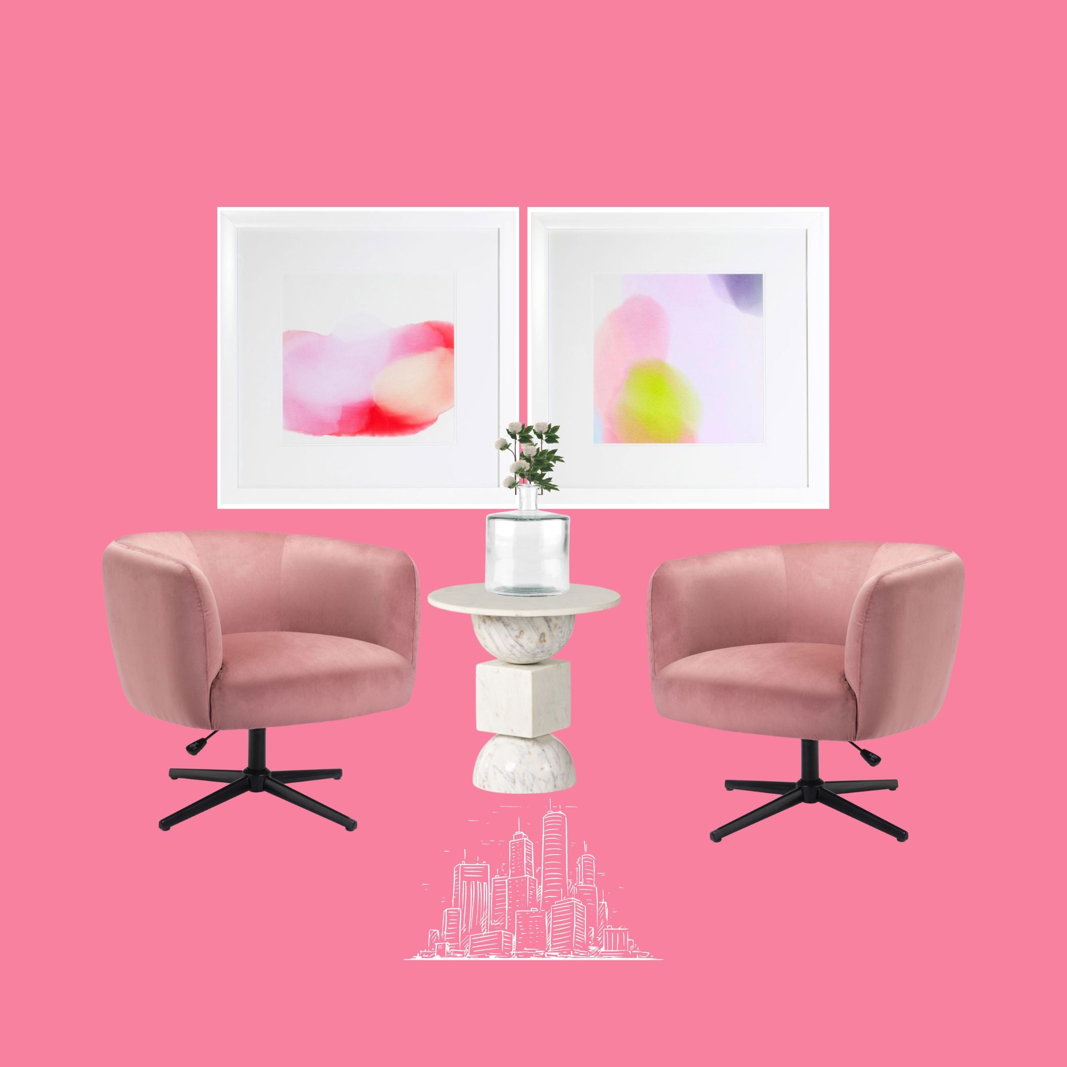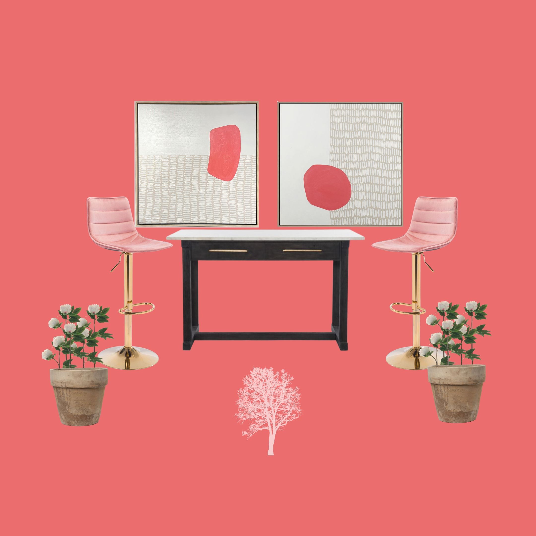 Introducing the Pink Collection, inspired by the new Barbie movie. Sink into dreamy pink hues with items such as pink velvet chairs and stunning art. We are so excited to help you create your own dream house! Whether that be a full remodel, having one of our designer bundles delivered right to your door, or adding a few simple accessories to your already fabulous space, we want to help. The Pink Collection has been carefully curated by our team of designers with everything you need for any type of space! We have bar stools, office chairs, desks, faux florals, and some of the most stunning art you will EVER see!