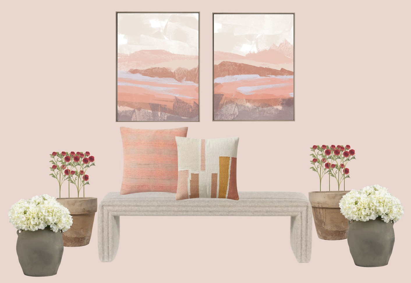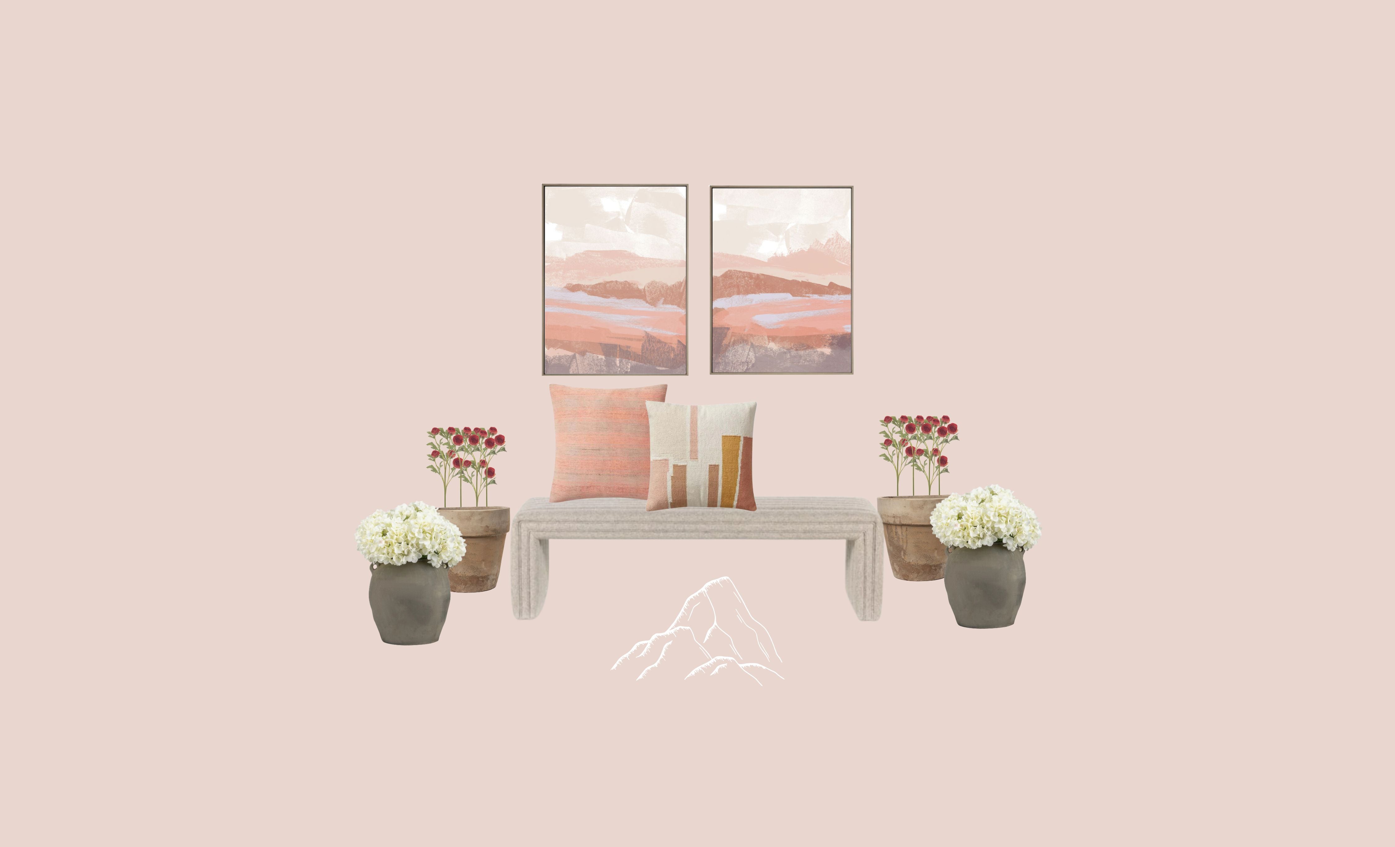 We want to help you style any space in any capacity! Whether that means remodeling with paint, wallcovering, cabinetry, or just adding a few pink accessories. With our bundles and this new collection, we have everything. If you're looking to add art and furniture and flip your whole space, check out the collection that you feel suits YOUR style best, or never be afraid to mix & match! Within each of the collections are some of our favorite accessories if you're just looking to add a pop of pink. Art is another great way to add some color without redesigning your whole room. Whatever you're looking to do, Blanc & Noir Pink Collection is sure to be the answer! Below are some of our FAVORITE art pieces that will add a subtle tone of pastel pink to your walls and get you that Barbie Inspired masterpiece you've been waiting for. Find them on the website titled Tropical Window Landscape & Pink Grey.