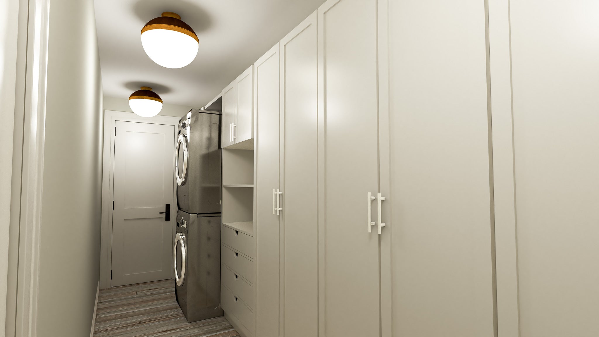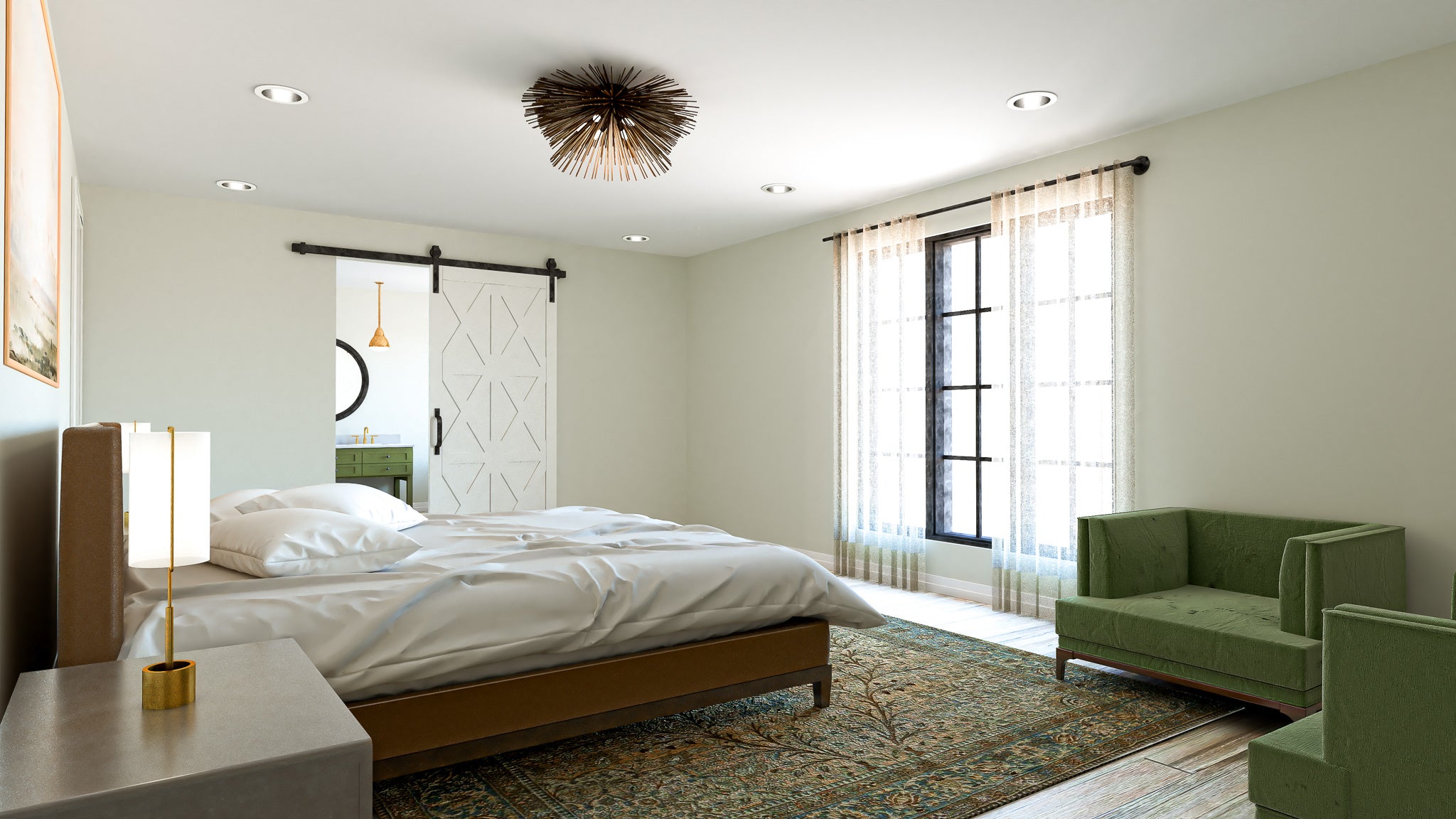 I wanted to create a true Primary Suite where the bathroom was connected with a beautiful transitional barn door. The views called for admiration so I created a wall where the bed could see out the expanded windows. And lastly, I created a walk in closet complete with a washer & dryer for additional functionality.