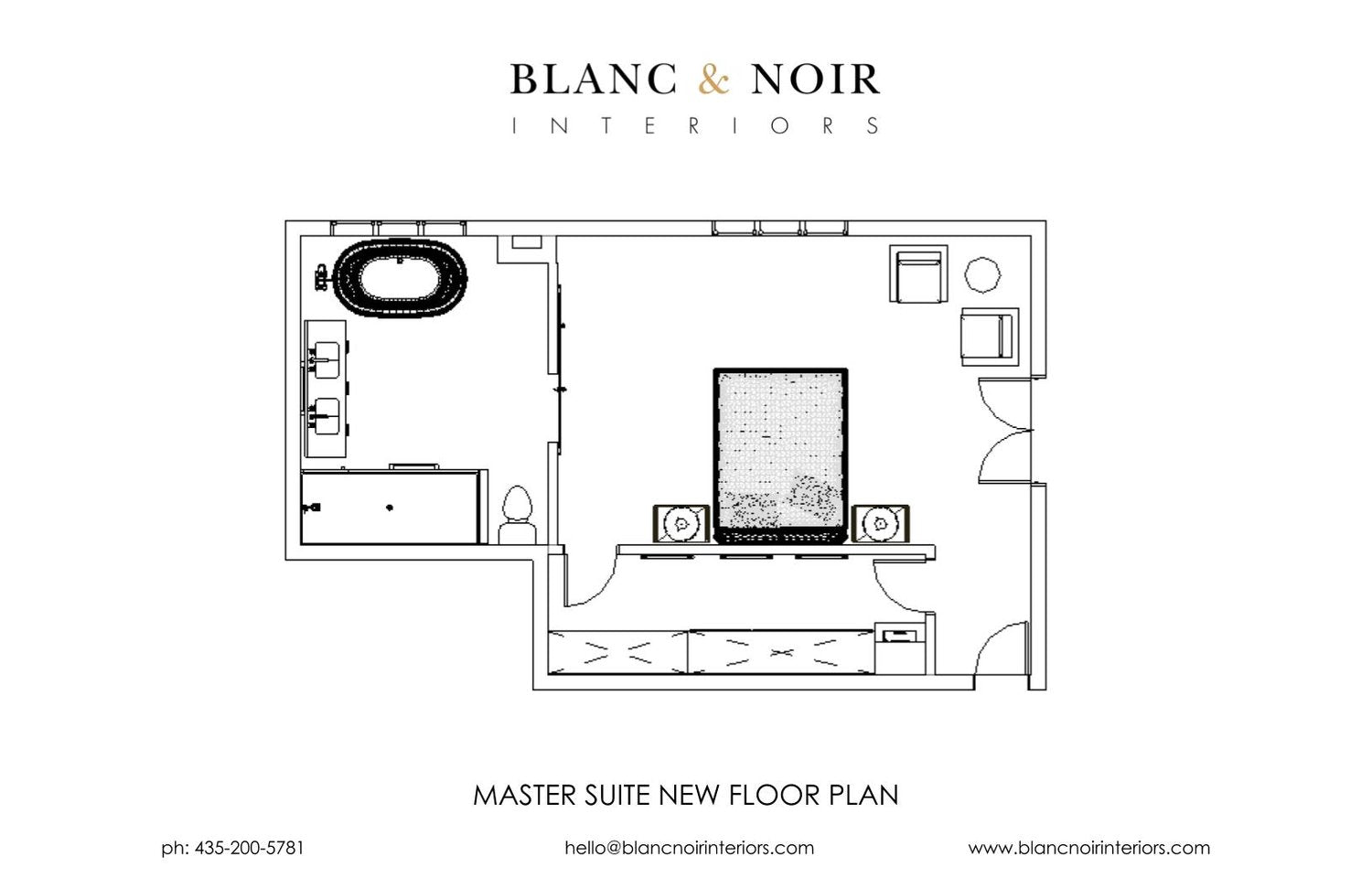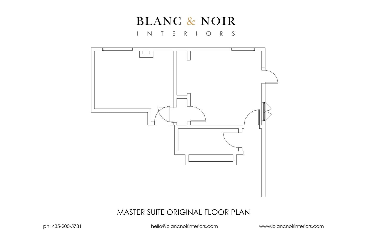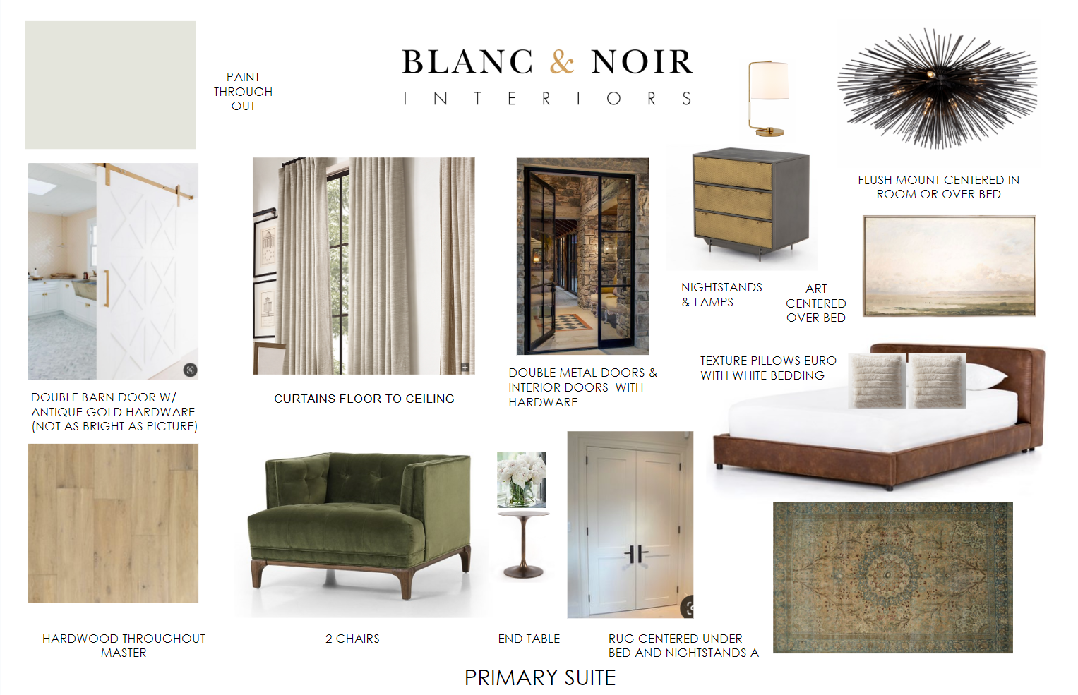 I started out with a floor plan with the existing space and re-configured it to accommodate more of the needs a luxury space would require. There was plenty of space to create a Primary Suite with a large bathroom, walk in closet (even a washer & dryer), and opening up the windows to create a view made this space a lot more valuable. I added larger windows so that one could see the beautiful view outside from the bed. This also gave more wall space for the art and nightstands. Throwing in an antique rug seemed ideal for this older home that just needed a refresh. I wanted to bring in the beautiful nature of the outside by adding these textural velvety green chairs. Take a look at the original floor plan versus the proposed plan as well as the design concept below.